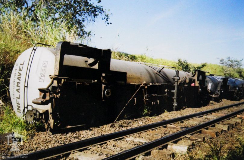 Fotografia com imagem de dois vagões tanques tombados ao lado da linha em trecho de corte.