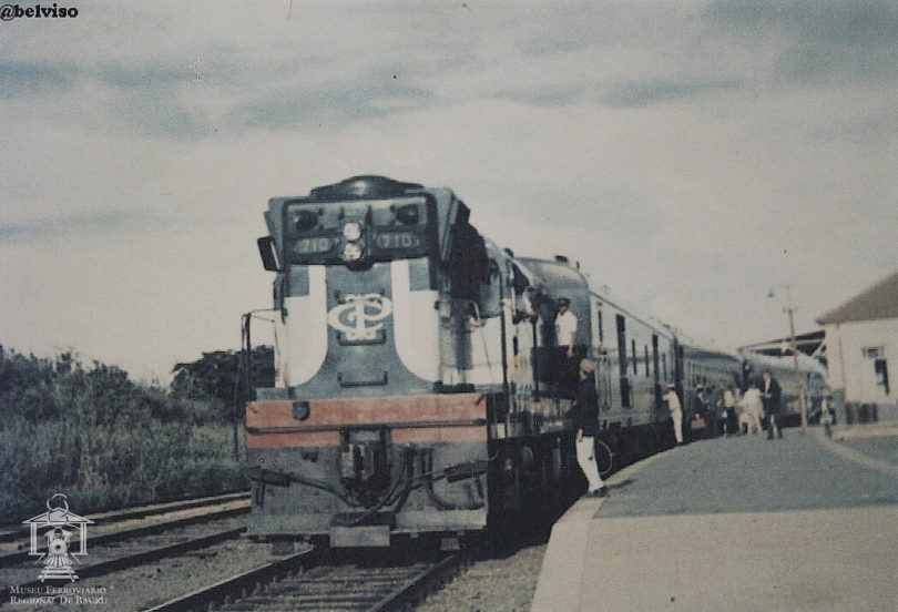 Fotografia a cores impressa em papel, com imagem de uma composição de passageiros na estação de Quintana. Locomotiva EMD G12 710.