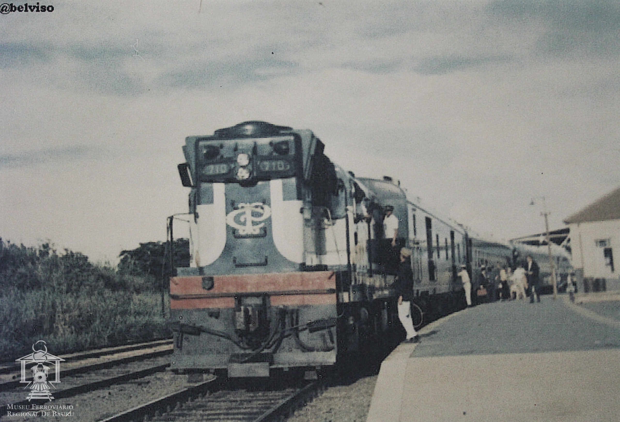 Fotografia a cores impressa em papel, com imagem de uma composição de passageiros na estação de Quintana. Locomotiva EMD G12 710.