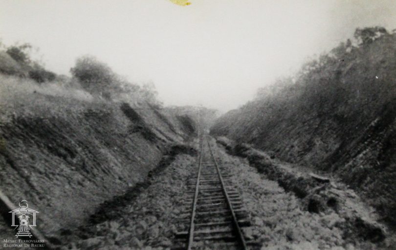 Fotografia com imagem de trecho em corte no km 158. Na legenda da imagem lê-se “NOB: km 158. Córte dos Moreiras”.