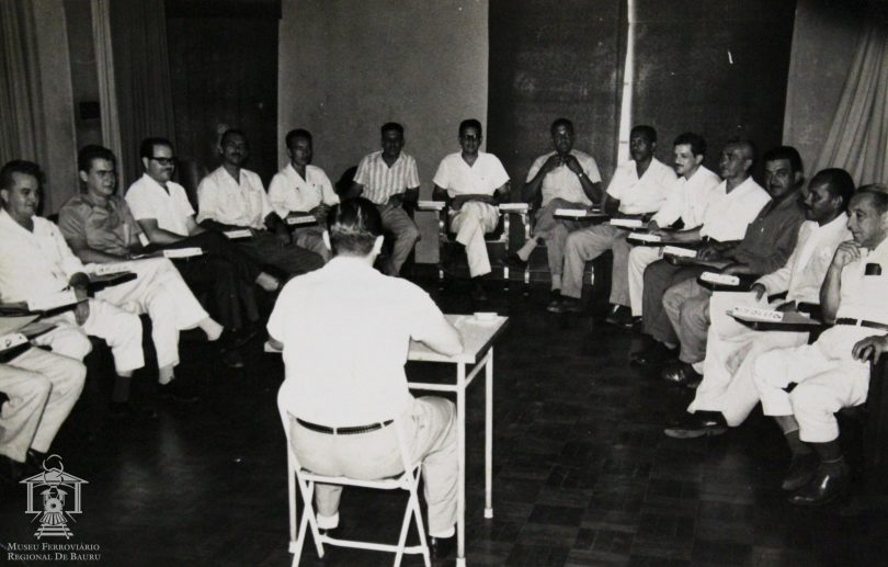 Fotografia com imagem de curso, onde os alunos estão dispostos em semi circulo com professor ao meio, sala com as cortinas fechadas e carteiras com estrutura em metal.