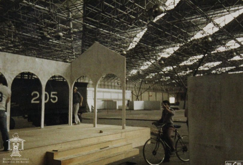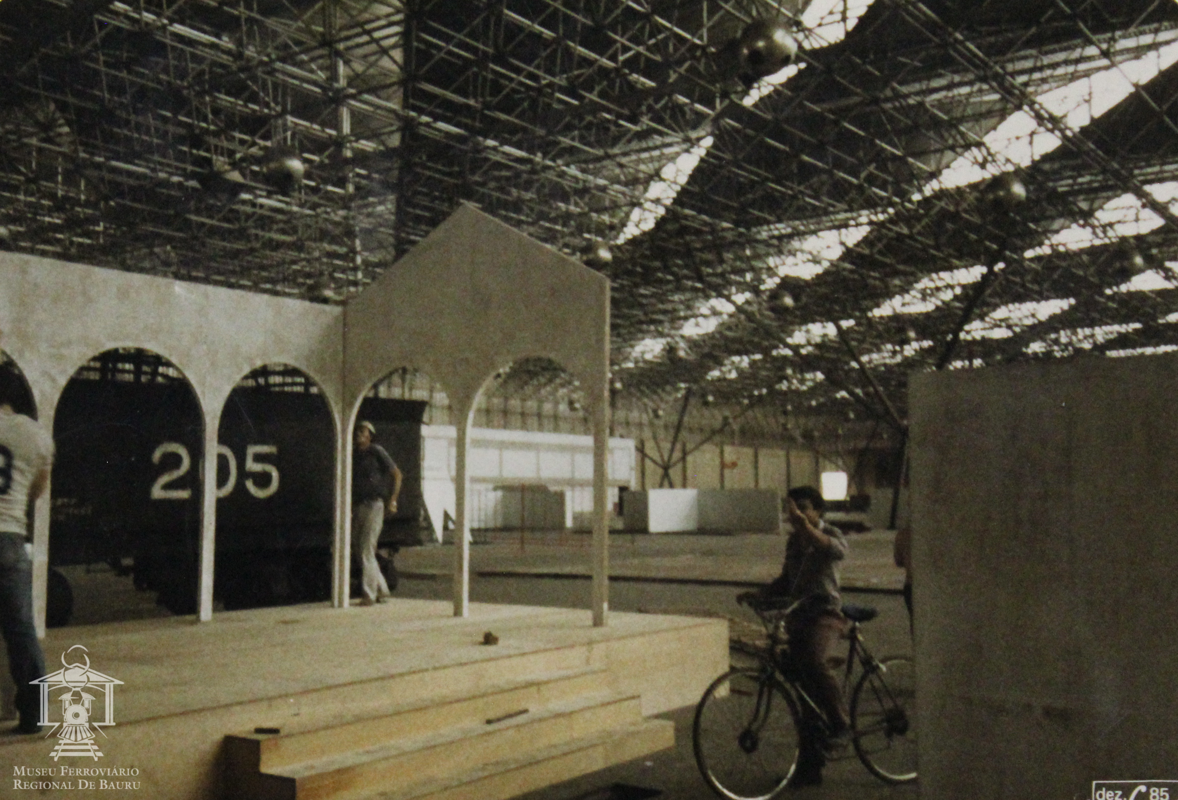 Fotografia a cores em papel fotográfico, com imagem de um estande de uma exposição sendo montado, mostrando o tender da locomotiva 205 da antiga Rede Mineira de Viação RMV