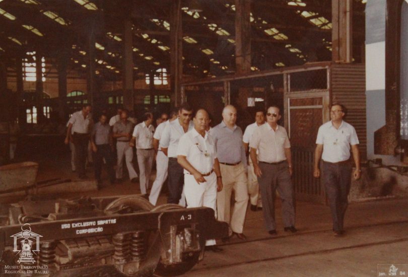 Fotografia a cores em papel fotográfico, com imagem de um grupo de pessoas visitando o interior da oficina de carros em Bauru.
