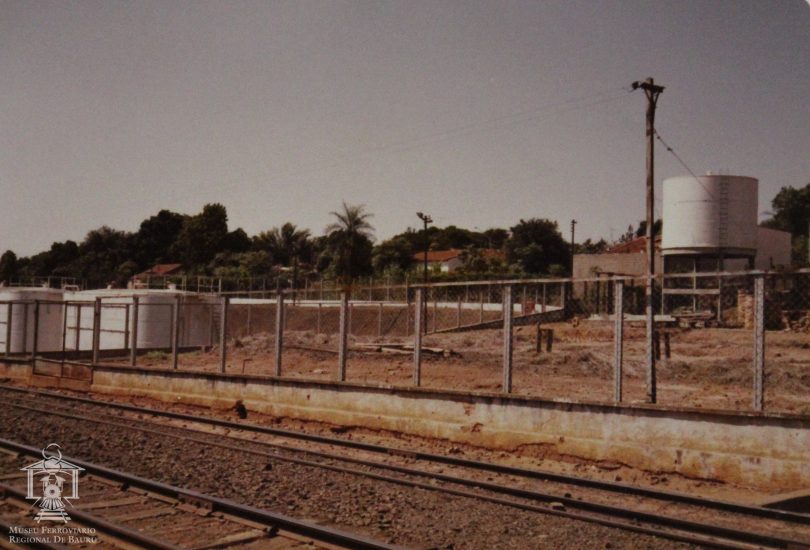 Fotografia a cores em papel fotográfico, com imagem do posto de abastecimento de diesel para locomotivas em Bauru.