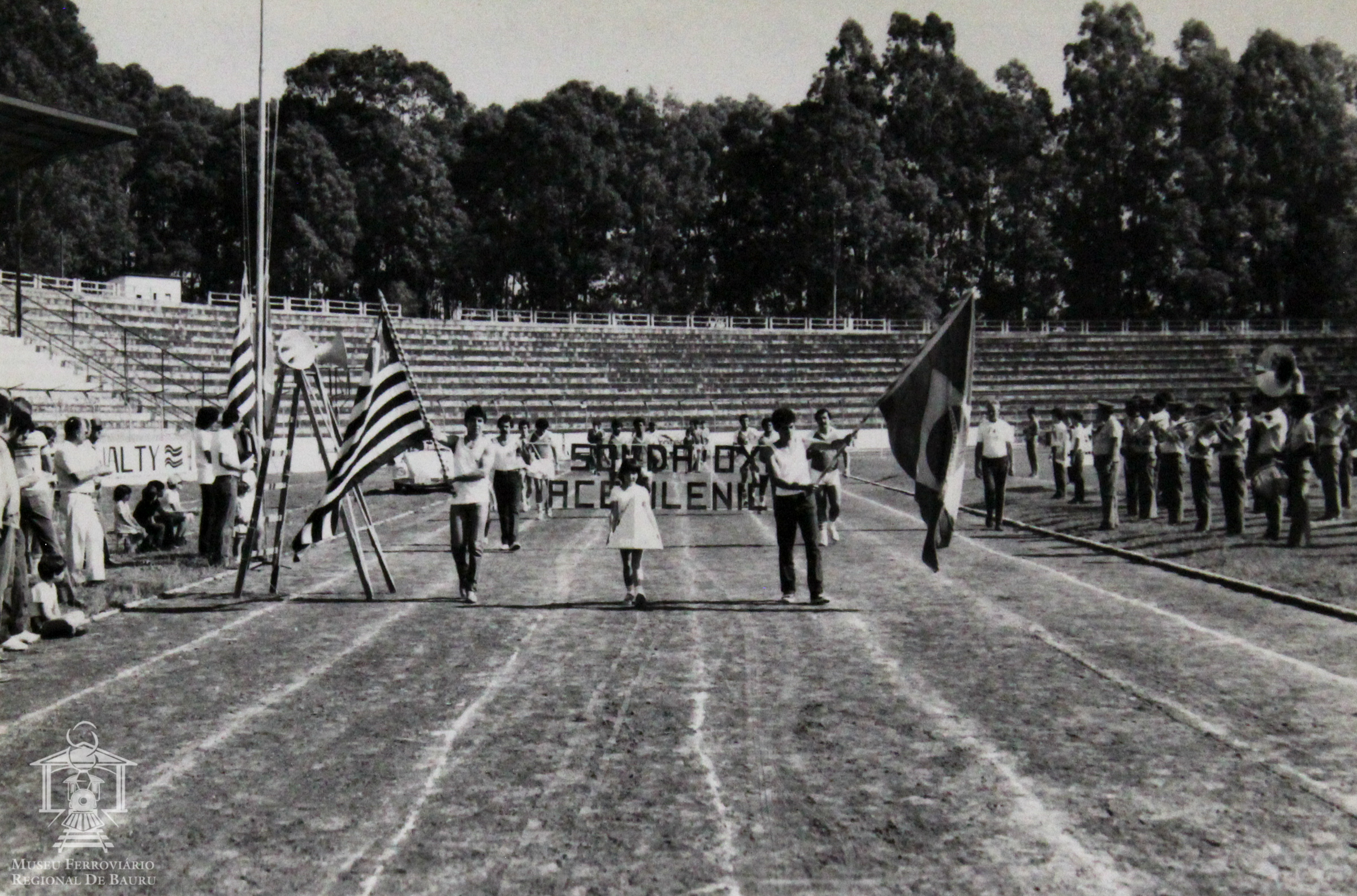 Fotografia com imagem do desfile da delegação da equipe de solda oxi acetilenica no estádio Alfredo de Castilho, ao lado a banda da PM.