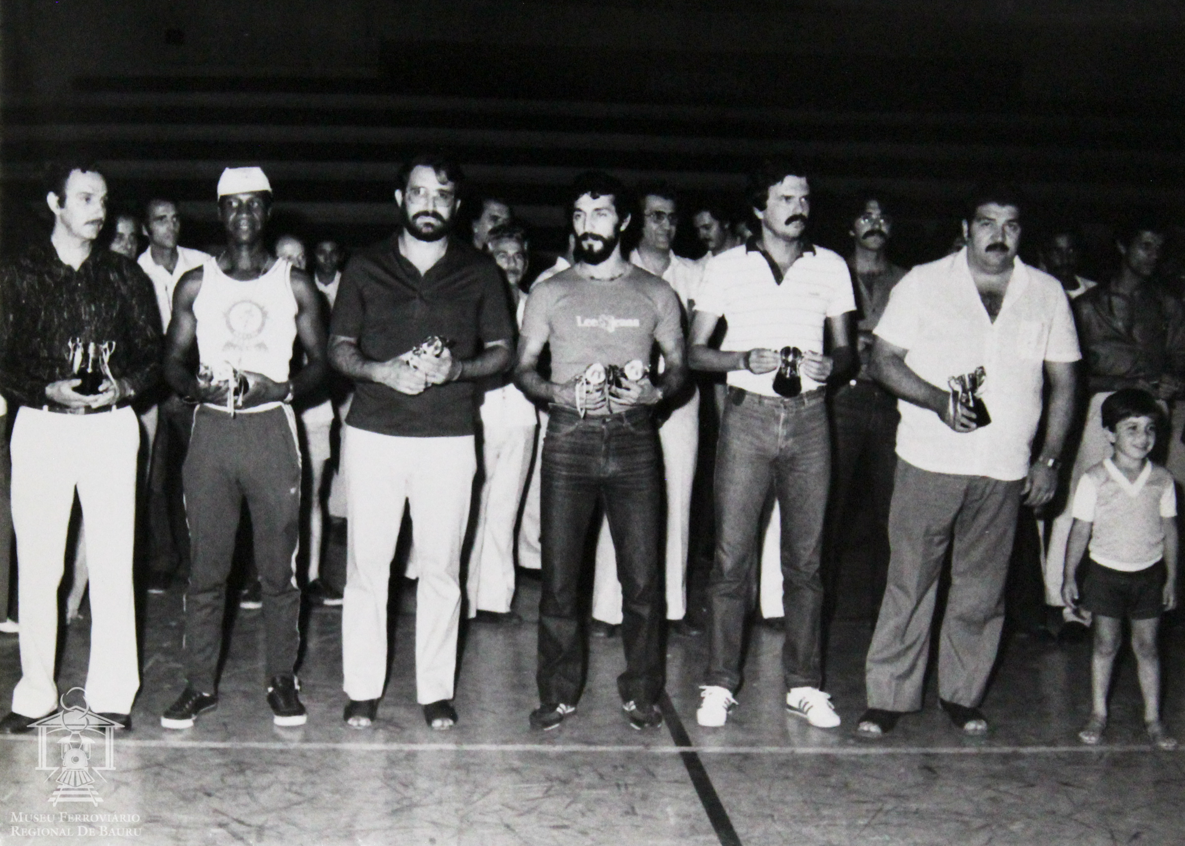 Fotografia com imagem de seis ferroviários com seus troféus ganhos nas olimpíadas ferroviárias.