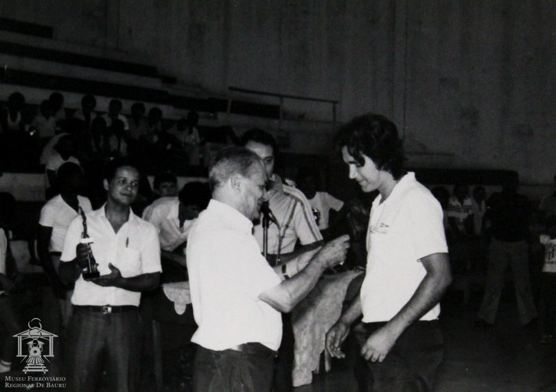 Fotografia em preto e branco em papel, com imagem da entrega de prêmios aos vencedores nas modalidades das olimpíadas ferroviárias.