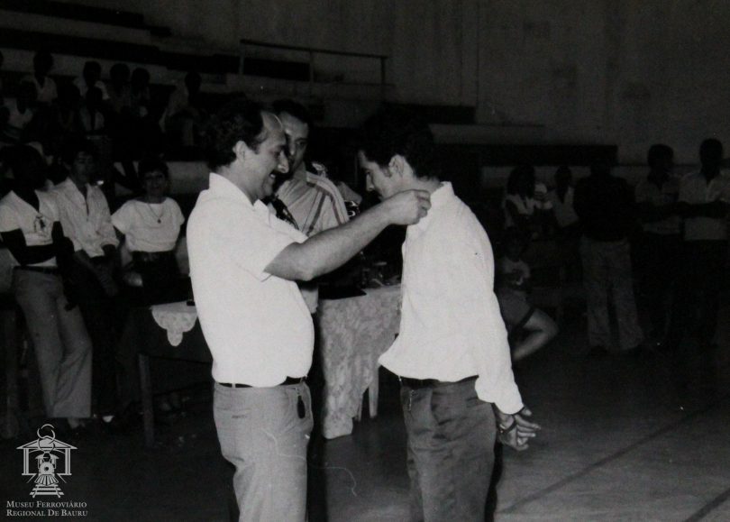 Fotografia em preto e branco em papel, com imagem da entrega de prêmios aos vencedores nas modalidades das olimpíadas ferroviárias.